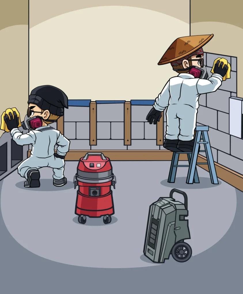 Pumps, dehumidifiers, HEPA filters, and protective gear.